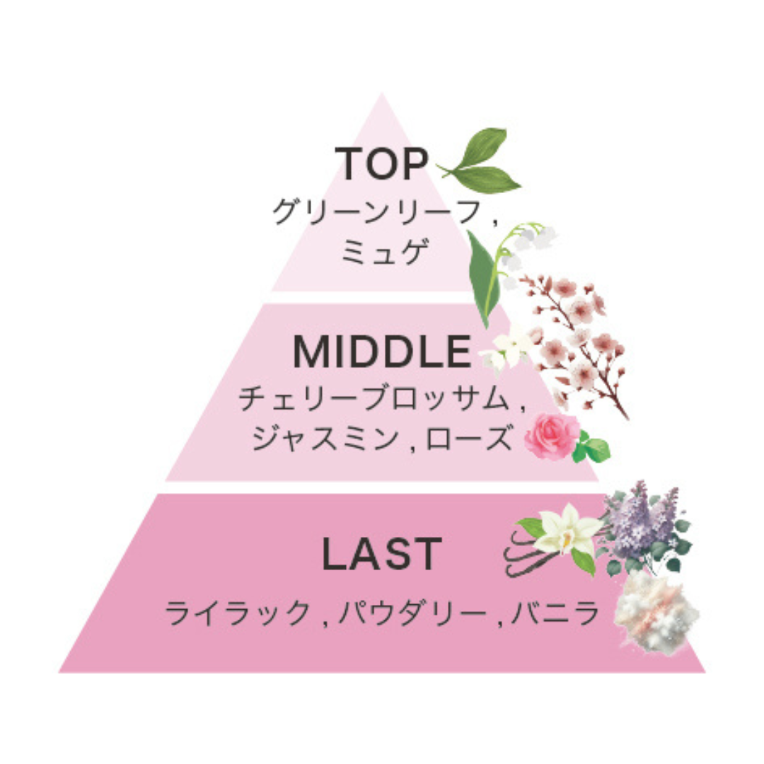 | 商品仕様 | *優雅で上品な桜の香り 芳醇で優美なソメイヨシノをイメージした、華やかで心地よい桜の香りをお届けします。 時間とともにライラックとバニラのパウダリーな甘さが溶け込むように広がり、奥行きのある余韻をもたらします。 |