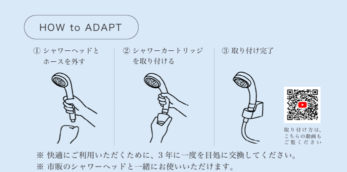 | 注意事項 | ※ 快適にご利用いただくために、3年に一度を目処に交換してください。 ※ 市販のシャワーヘッドと一緒にお使いいただけます。 |